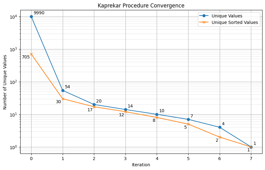 It’s also not clear why the convergence should be so rapid: if each iteration cut down the number of surviving numbers by half, it would still take about 13 iterations to collapse to a single value. In that sense, Kaprekar converges “surprisingly” quickly.