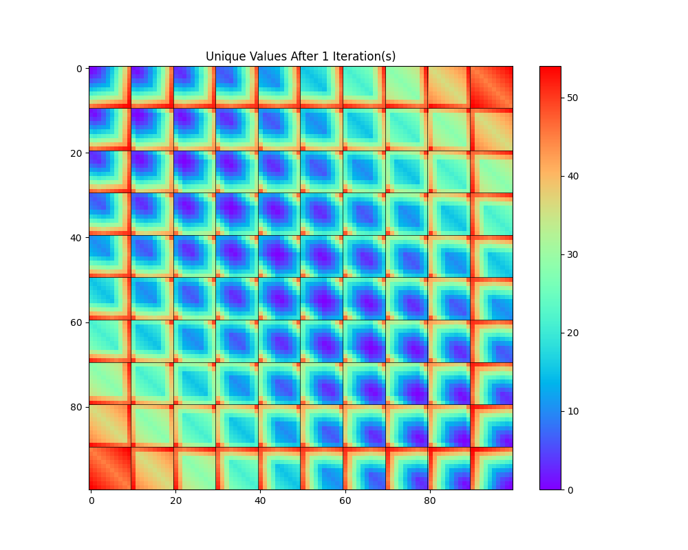Another way to use the 100x100 grid is to assign a color to every unique number after $k$ iterations. If two pixels have the same color, we know they will collide in $k$ iterations or fewer.