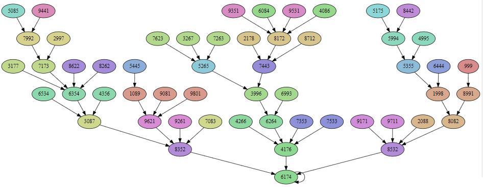 On this graph, each number is a node, and you can follow the arrow to see where the Kaprekar function sends that number. The nodes are color-coded according to their sorted digits, so any two numbers which are the same modulo the digit sorting operation will be the same color. That makes it obvious that digit sorting is still responsible for a large number of collapses. For example, we can see that 7623, 3267, and 7263 (shown in light green) all map to 5265, and that is entirely due to them have the same set of digits, just in a different order.