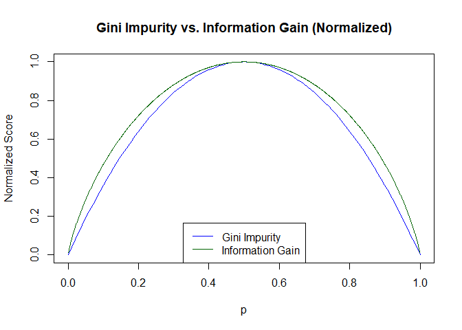 Both functions are symmetric about the line \(x = 0.5\) and both are strongly concave. This turns out to be very important, because it means it’s always possible to choose a good cut point. Other metrics, such as accuracy, don’t have this property but instead give the exact same “goodness” score for many different candidate splits.
