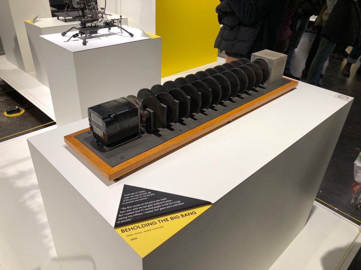 The machine has a electric motor happily whirring away at one end (click the image for a video showing it action) and a solid block of concrete at the other. Normally that would be a recipe for disaster but because each gear steps the revolution speed down by a factor of 10, and because so many gears are chained together, the motion is infinitesimal by the end.